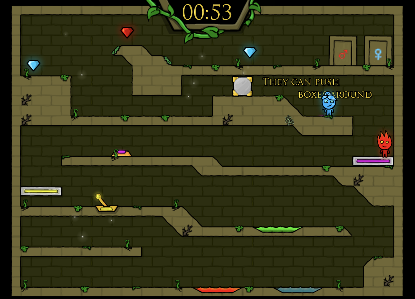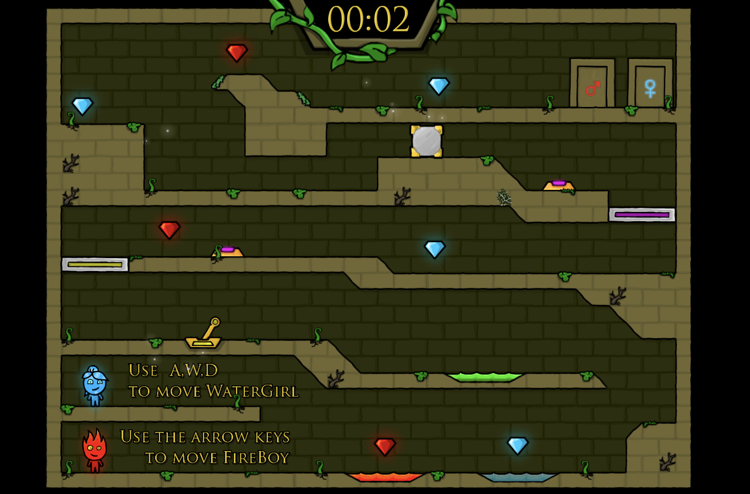 보석을 다 모아야 하고, 제한시간내 들어와야 100% 클리어를 하게 됩니다. 2인용으로 친구와 함께 시간떼우기 정말 좋은 물과불 파이어보이앤 워터걸 게임입니다. 원제목은 포레스트템플로 2인용게임으로 많이 즐겨하고 있고, 물과불게임으로도 알려져있습니다. 시리즈가 흥행을 했기에 버전도 꽤나 많이 있습니다.
